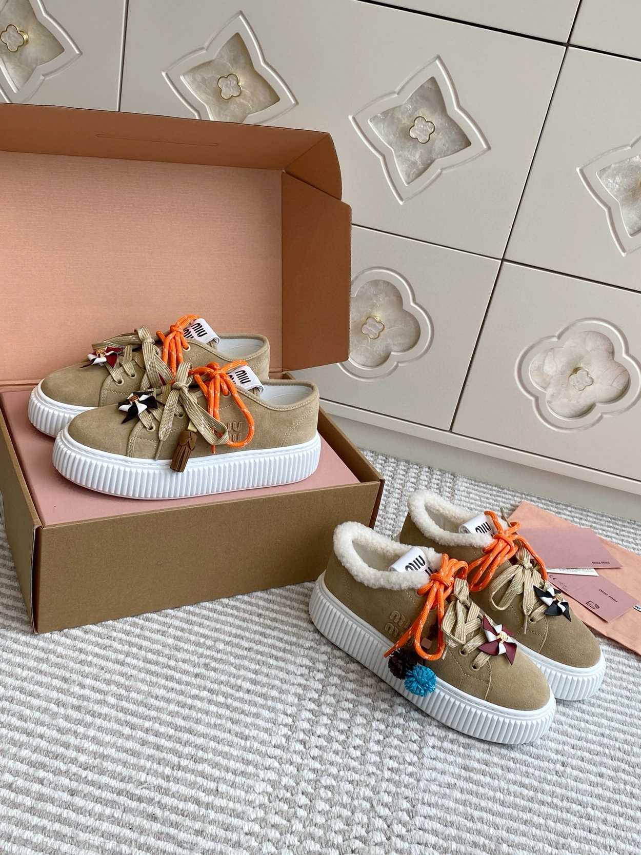 미우미우 플룸 발레리나 스니커즈 (컬러 데저트 베이지)