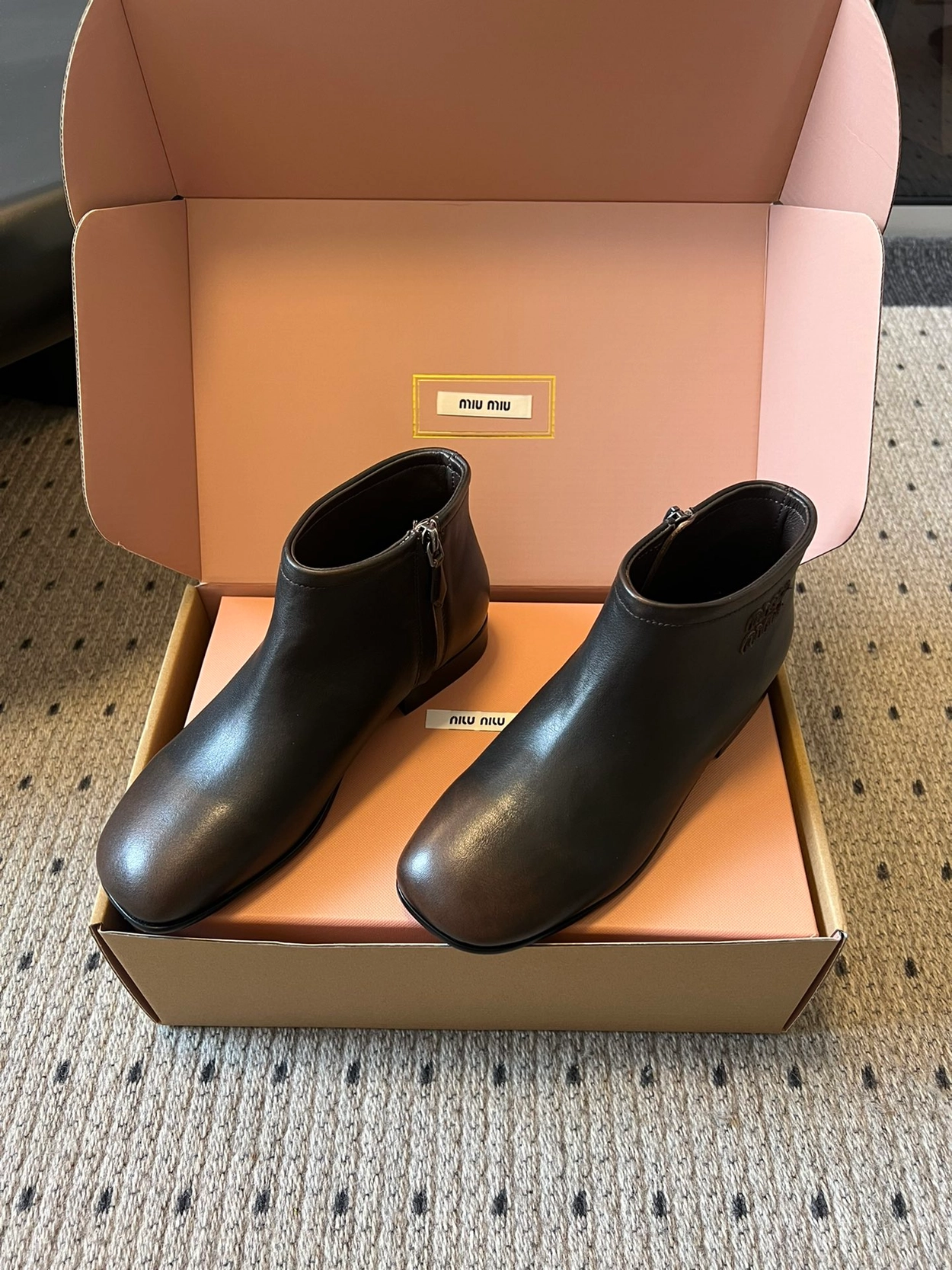 미우미우 25ss 레트로 하이엔드 스퀘어 토 앵클 부츠